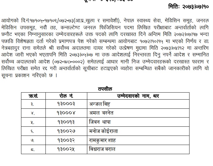 मेडिसिन समूहको कल्सलटेन्ट जनरल फिजिसियन पदका मागेको दरखास्तको फारम भर्ने मिति भन्दा पछि उनीहरुले विशेषज्ञ दर्ता प्रमाणपत्र बुझाएको आयोगको ठम्म्याई छ । गत कात्तिक १० गतेको निर्णय भन्दै आयोगले आज सूचना जारी गरेको छ ।