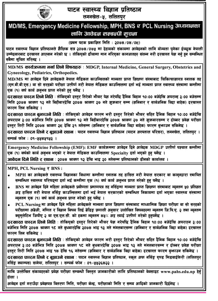 पाटन स्वास्थ्य विज्ञान प्रतिष्ठानले माग्यो एमडीएमएस, एमपीएच, पीसीएल नर्सिङ लगायतमा आवेदन