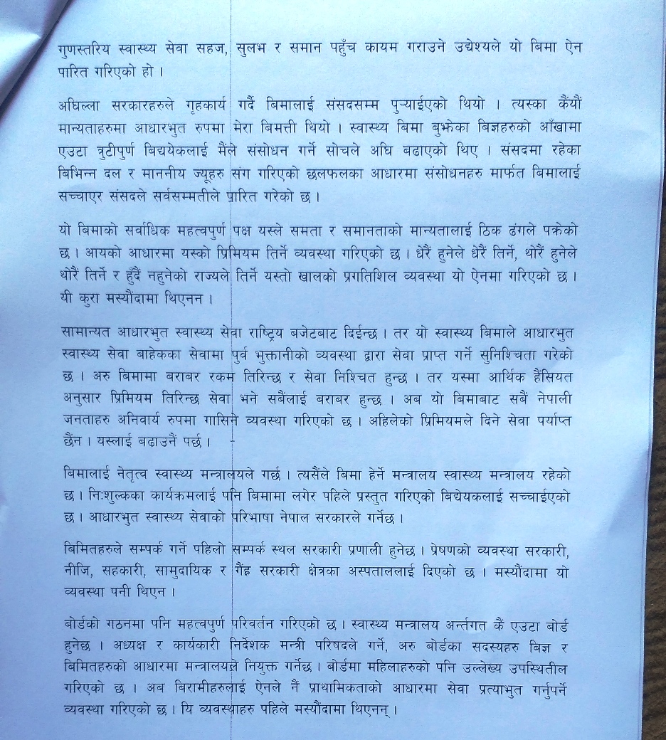 त्यसबाहेक अन्य धेरै नीतिगत कार्यहरु अघि बढेको उनले दावी गरे ।आफ्नो कार्यकालमै स्वास्थ्य ऐन ल्याउन चाहना भएपनि त्यो सम्भव नभएको भन्दै पहिलो डाफ्ट भने ल्याउन सफल भएको बताए ।