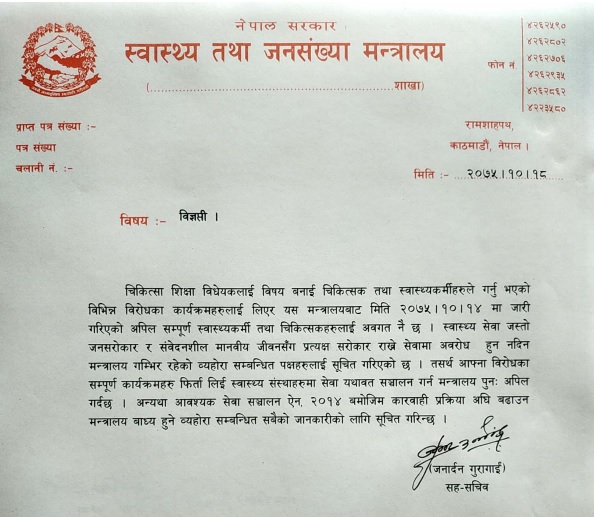 मन्त्रालयका सहसचिव जनार्दन गुरागाईँले आज जारी गरेको विज्ञप्तीमा चिकित्सा शिक्षा विधेयकको विषयलाई लिएर चिकित्सक तथा स्वास्थ्यकर्मीले सेवा अबरुद्ध गरेको थाह भएको र त्यसले स्वास्थ्य जस्तो जनसरोकार र सम्वेदनशील सेवालाई सुचारु राख्न मन्त्रालय गम्भीर रहेको उल्लेख छ ।