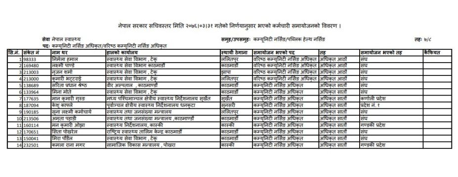 कम्युनिटी नर्सिङ अधिकृत ७/ ८ औँ तहको समायोजन सूची सार्वजनिक