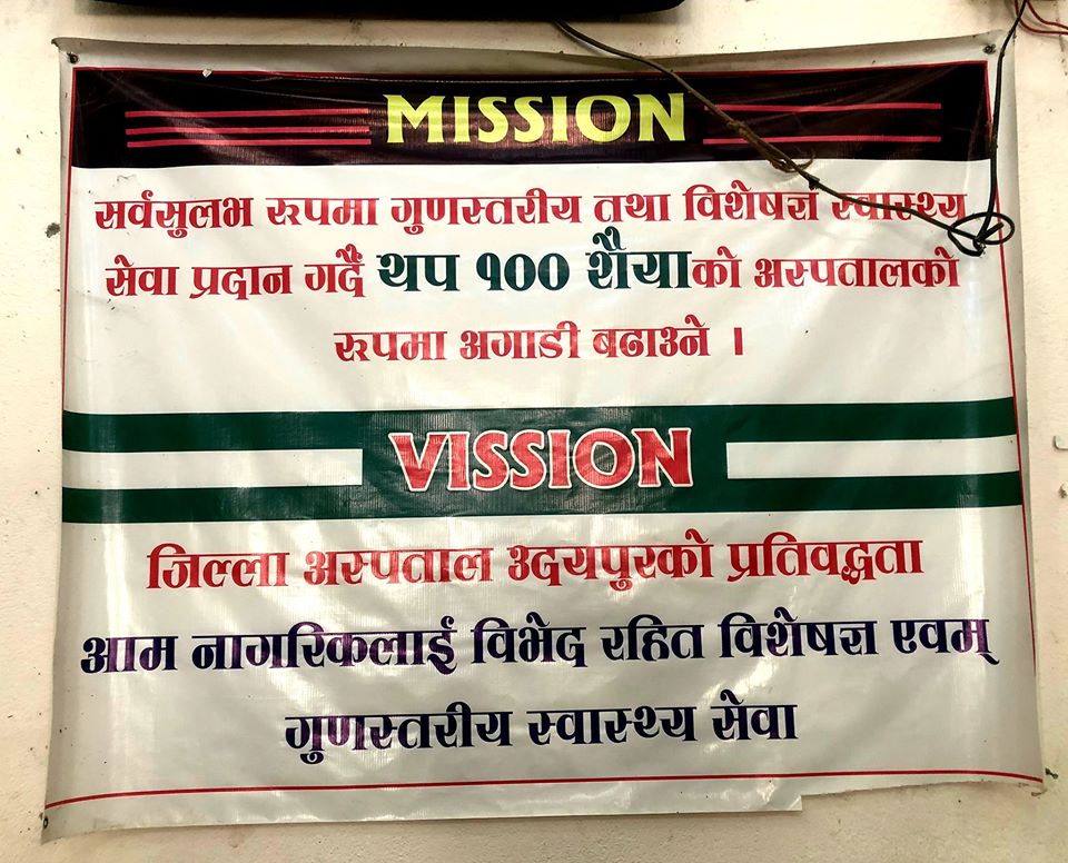 उदयपुरको गाईघाटस्थित जिल्ला अस्पताल उदयपुरको नाजुक अवस्था झल्काउने दृष्य हो । बिहीबार जब जिल्ला फुटबल सङ्घको अगुवाइमा अस्पताल निरीक्षणका लागि उदयपुरे युवाहरू पुगे, त्यहाँका स्थिति देखेर उनीहरू आश्चर्यचकीत र आक्रोसित भए ।