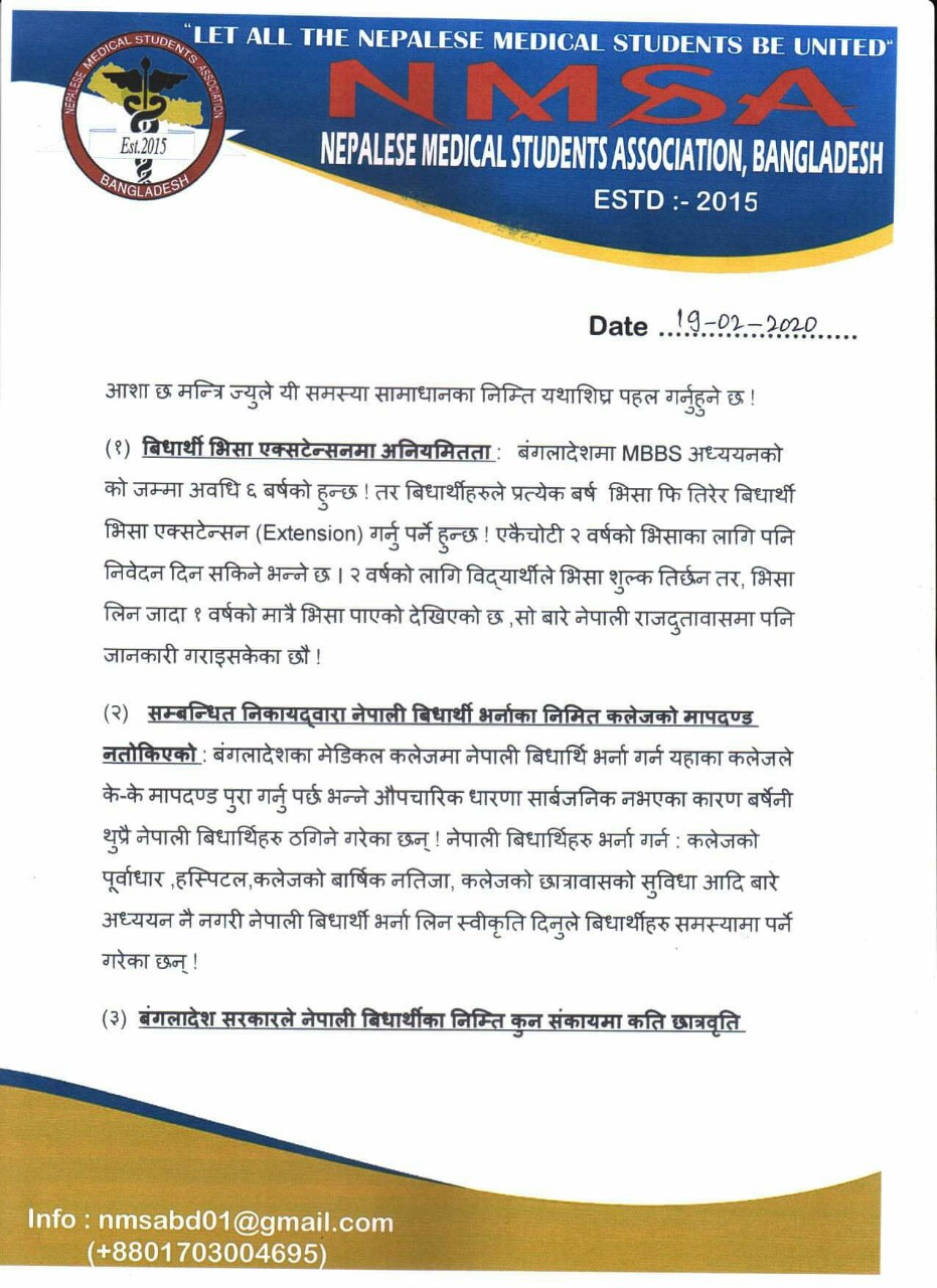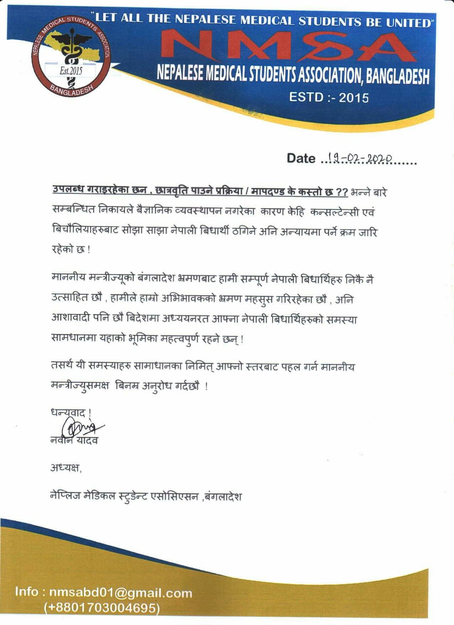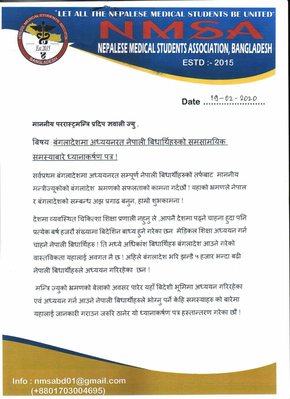बंगलादेशमा मेडिकल अध्ययनरत नेपाली विद्यार्थीद्धारा परराष्ट्र मन्त्री ज्ञवालीको ध्यानाकषर्ण