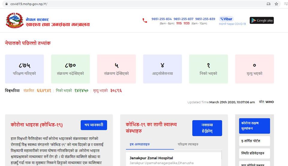 काठमाडाैँ , १६ चैत । स्वास्थ्य तथा जनसंख्या मन्त्रालयले कोरोना भाइरस (कोभिड-१९) नियन्त्रण तथा रोकथामको काम व्यवस्थित गर्न बनेको वेबसइट covid19.mohp.gov.np र हाम्रो स्वास्थ्य मोबाइल एप सञ्चालनमा ल्याएको छ ।