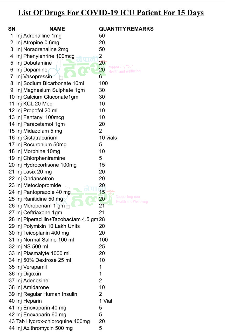 नेपाली हेल्थलाई प्राप्त भएको उक्त सूचीमा कोरोना संक्रमित एक व्यक्तिलाई १५ दिन आइसियूमा राख्नुपर्दा चाहिने औषधिको परिमाण उल्लेख छ । यो सूचीलाई उच्चस्तरीय समितिले समेत अनुमोदन गरेको छ ।
