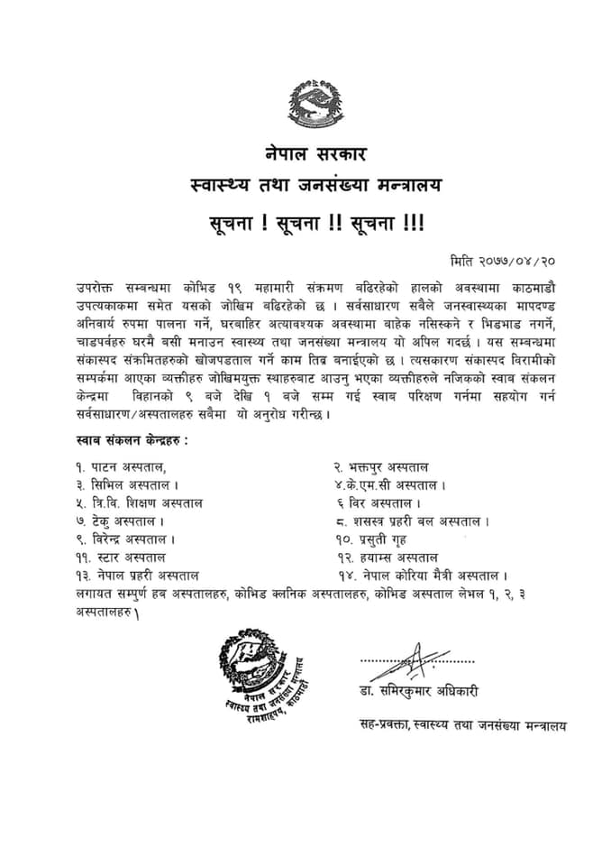 यसैगरी स्टार अस्पताल सानेपा, ह्याम्स अस्पताल धुम्बाराही, नेपाल प्रहरी अस्पताल महाराजगञ्ज र नेपाल कोरिया मैत्री अस्पताललाई पनि नमूना संकलन गर्ने बुथ तोकिएको छ ।