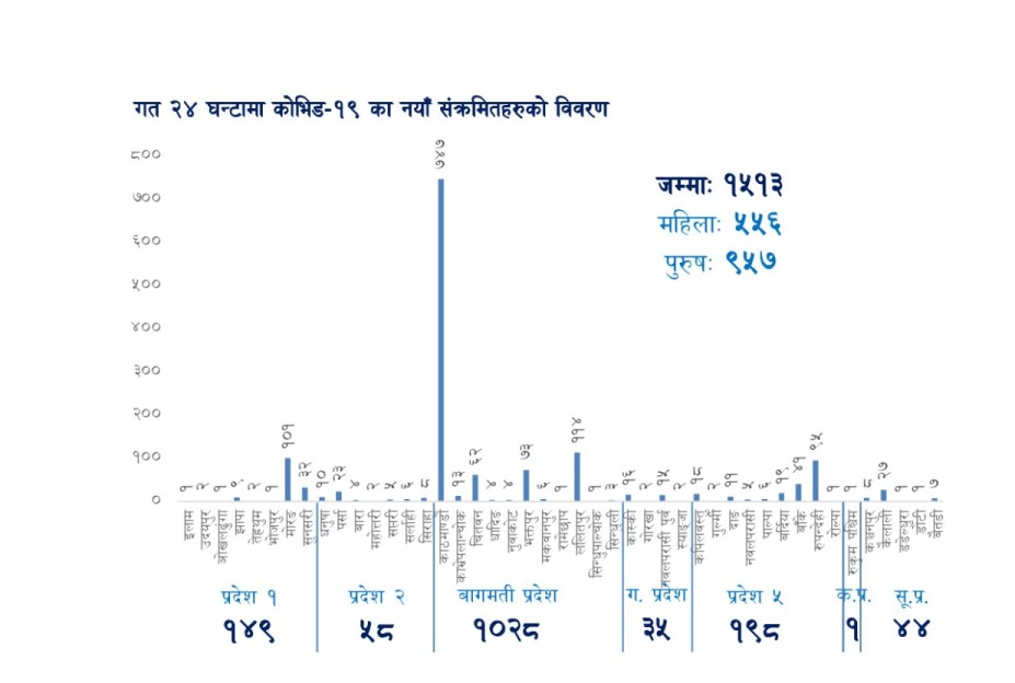 त्यसमध्ये सबै भन्दा बढी काठमाडौँमा ७४७ जनामा संक्रमण देखिएको छ । त्यससैगरी चौबिस घण्टामा थप ७३१ जना कोरोना जितेर डिस्चार्ज भएका छन् ।