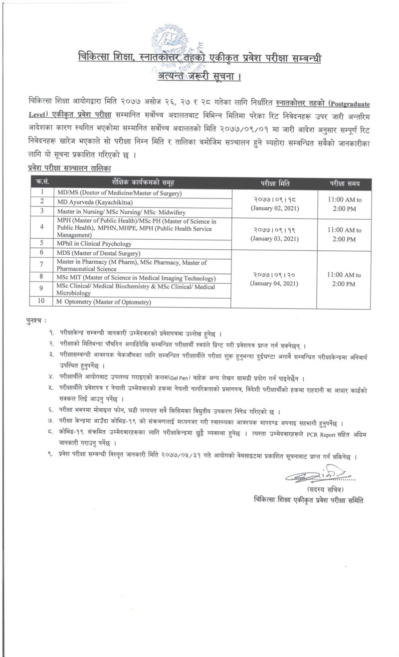 यस्तै, एमडीएस,एमफार्म,एमएससी,एमपीएस, एमएससी एमआइटी,एमएससी क्लिनिकलरमेडिकल बायोकेमिस्ट्री र एमएससी क्लिनिकल मेडिकल माइक्रोबायोलोजी, एमओको परीक्षा भने पुस २० गते हुनेछ ।
