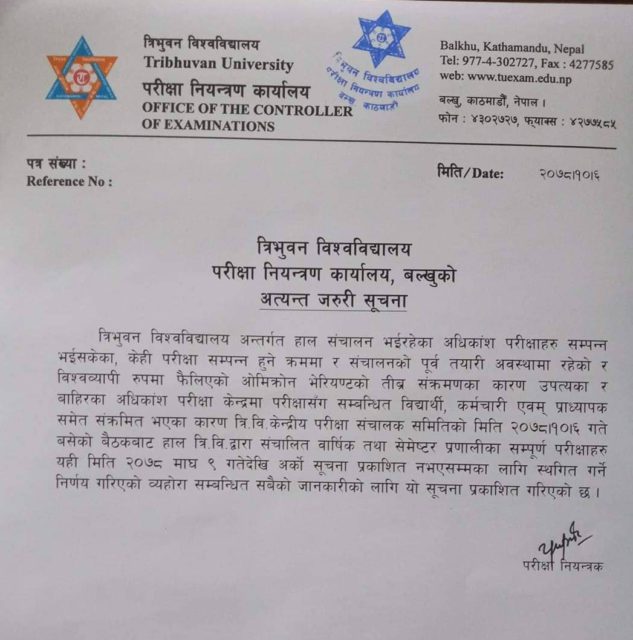 बैठकपछि जारी विज्ञप्तीमा कोरोनाको नयाँ भेरियन्ट ओमिक्रोनका कारण संक्रमण तिब्र गतिमा बढेको र त्यसबाट विद्यार्थी, कर्मचारी एवं प्राध्यापकहरु संक्रमित भएको कारण अर्को सूचना नआएसम्मका लागि परीक्षा स्थगित भएको उल्लेख छ ।