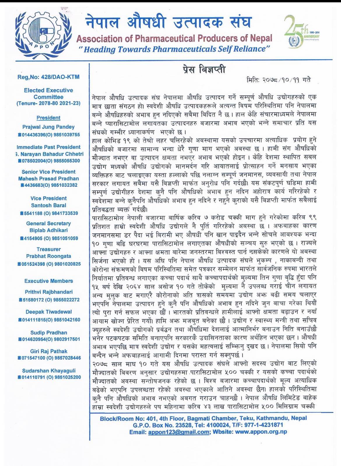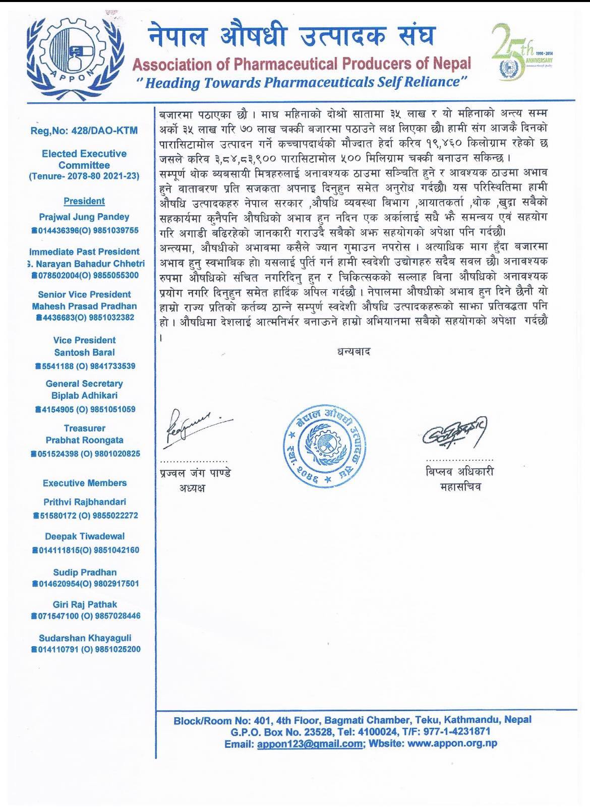 एपोनका अध्यक्ष प्रज्वलजंग पाण्डे र महासचिव विप्लभ अधिकारीद्धारा हस्ताक्षर भएको विज्ञप्तीमा अहिले पनि नेपाल औषधि लिमिटेड बाहेकको स्वदेशी उद्योगहरुले पुसमहिनामा करिब ४३ लख पारासिटामोल ५०० एमजीको चक्की बजारमा पठाएको, माघ महिनाको दोस्रो सातामा ३५ लाख चक्की र यो महिनाको अन्तिममा अर्को ३५ लाख गरी ७० लाख चक्की बजार पठाउने लक्ष्य लिएको उल्लेख छ ।