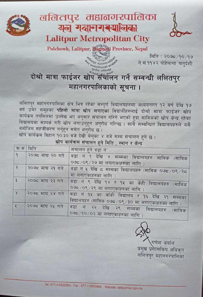 काठमाडौँ, २० माघ । ललितपुर महानगरपालिकाले १२ देखि १७ वर्ष उमेर समूहका बालबालिकालाई कोभिडविरुद्धको खोप फाइजरको दोस्रो मात्रा दिने भएको छ ।