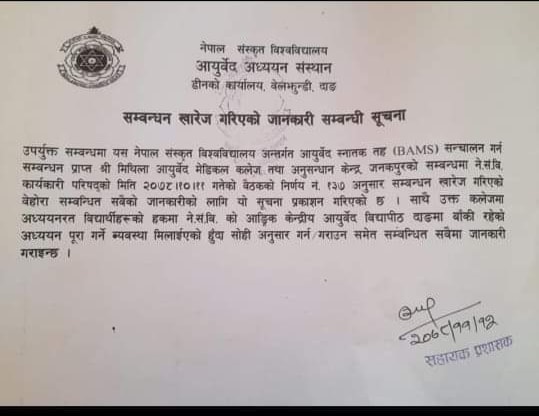 नेसंविको आयुर्वेद अध्ययन् संस्थान डीनको कार्यालयले बिहीबार जारी गरेको सूचनामा मिथिला आयुर्वेद मेडिकल कलेजमा अध्ययन गरिरहेका विद्यार्थीलाई आफ्नो आंगिक केन्द्रीय आयुर्वेद विद्यापीठ दाङमा बाँकी रहेको अध्ययन् पुरा गर्ने व्यवस्था मिलाइएको जनाइएको छ ।