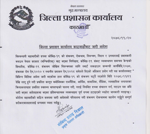 कोरोनाको नयाँ भेरियन्ट ओमिक्रोनको संक्रमण कम हुँदै जान थालेपछि गत २३ माघ देखि जिल्ला प्रशासनले काठमाडौँले लकडाउन खुकुलो बनाउँदै गएको थियो । यद्धपी आंशिक रुपमा स्मार्ट लकडाउन जारी रहेको बताइएको थियो । गत २३ माघ देखि आमससभा जुलुस भेला र मेलाबाहेकका कार्य खुकुलो बनाएको थियो ।