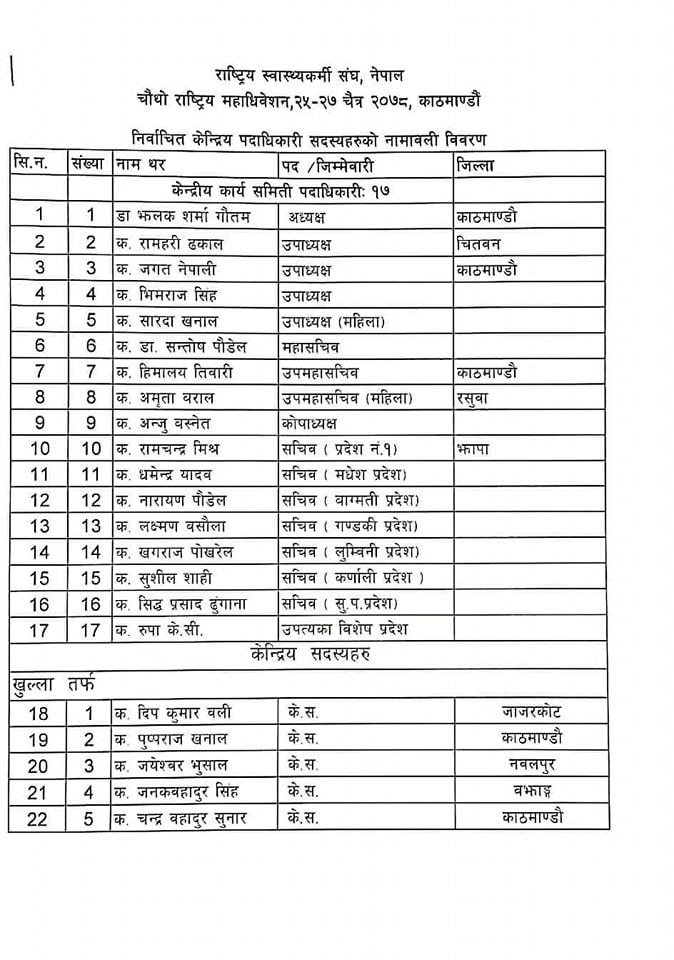 महाधिवेशनले डा झलक गौतमको अध्यक्षतामा १५१ सदस्यीय नयाँ कार्यसमिति समेत निर्वाचित गरेको छ । जसमा चार जना उपाध्यक्ष, एक महासचिव, दुई जना उपमहासचिव, आठ जना सहसचिव, एक कोषाध्यक्ष सहित १७ जना पदाधिकारी रहेका छन् ।