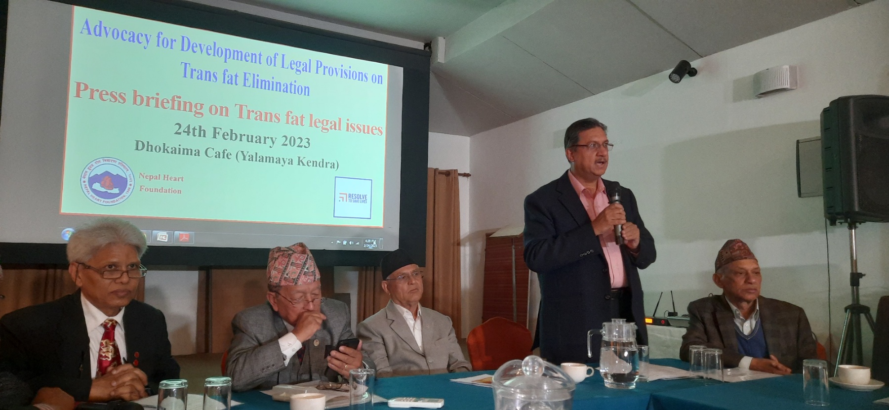 शुक्रबार नेपाल हृदयरोग निवारण प्रतिष्ठानले आयोजना गरेको ‘नेपालमा खाद्य पदार्थमा ट्रान्सफ्याटको मात्रा सिमित गर्ने कानूनी प्रावधानको खाँचो’ विषयक पत्रकार अन्तरक्रिया कार्यक्रममा सरोकारवाला पक्षका विभिन्न विज्ञहरुले आ आफ्नो धारणा राखेका थिए ।
