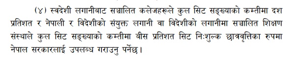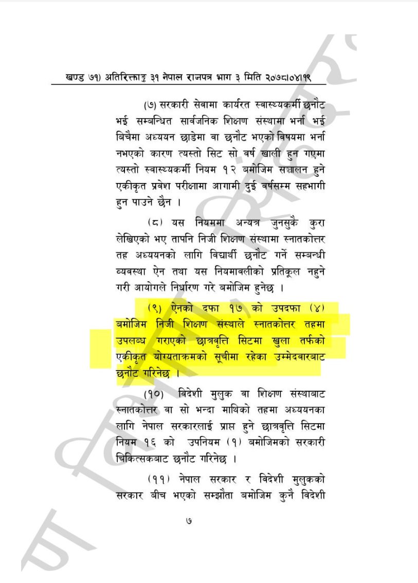 सोही ऐनलाई टेकेर जारी गरिएको राष्ट्रिय चिकित्सा शिक्षा (पहिलो संसोधन) नियमावली २०७८ मा भने निजी शिक्षण संस्थाले स्नातकोत्तर तहमा पनि छात्रबृत्तिको व्यवस्था गर्नु पर्ने उल्लेख छ ।