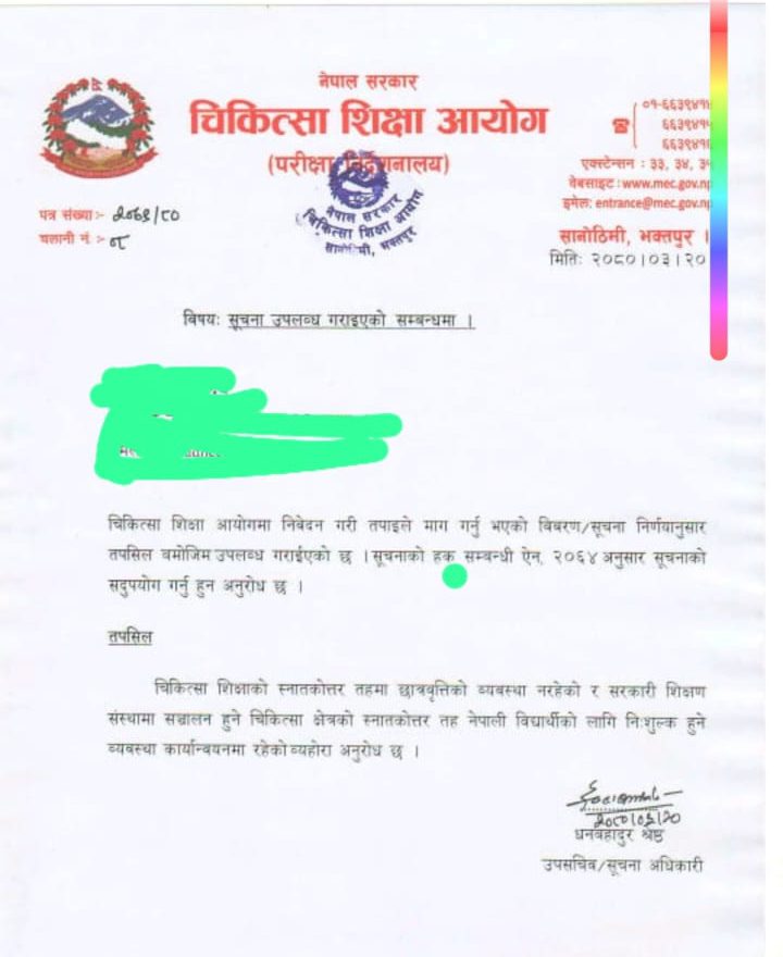 निजी मेडिकल कलेजहरुले स्नातकोत्तर तहमा दिनु पर्ने १० प्रतिशत छात्रबृत्ति नदिएको भन्दै केही विद्यार्थीहरुले चिकित्सा शिक्षा आयोगको ध्यानाकर्षण गराएका थिए । उनीहरुले त्यसमा समेत स्पष्ट जवाफ नपाएपछि आयोगसंग सूचनाको हक अन्तरगर्त छात्रबृिित्तको व्यवस्था कार्यान्वयनमा छ कि छैन भनेर सूचना माग गरेका थिए ।