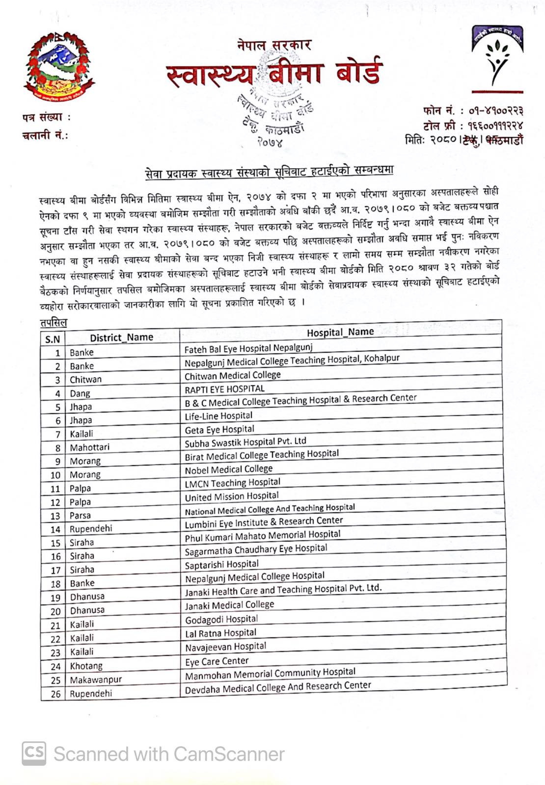 बीमा बोर्डले २०७९/८० को बजेट बक्तत्व्य पश्चात सूचना टाँस गरी सेवा स्थगित गरेका, बजेट बक्तव्यले निर्दिष्ट गर्नु भन्दा अगावै स्वास्थ्य वीमा ऐन अनुसार सम्झपौँता भएका तर आर्थिक वर्ष २०७९/८० को बजेट बक्तव्य पछि अस्पतालको सम्झौँता अवधी समाप्त भई पुन नवीकरण भनभएका वा हुन नसकी स्वास्थ्य वीमाको सेवा बन्द भएका निजी स्वास्थ्य संस्थाहरु र लामो समय सम्म सम्झौँता नबीकरण नगरेका स्वास्थ्य संस्थाहरुलाई सूचीबाट हटाएको हो ।