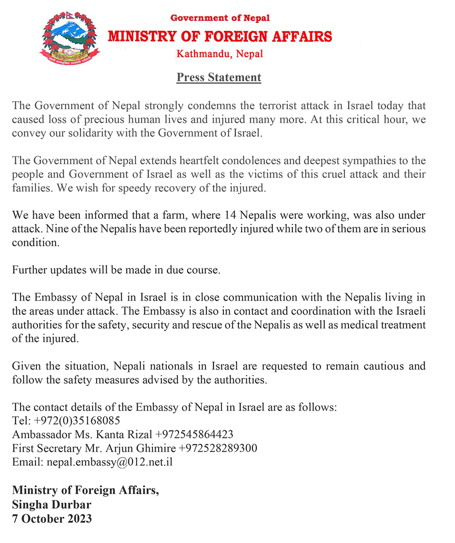 काठमाडौँ, २० असोज । इजरायलमा हमासको आक्रमणमा परी नौ नेपाली घाइते भएको र तीमध्ये दुईको अवस्था गम्भीर रहेको परराष्ट्र मन्त्रालयले बताएको छ ।