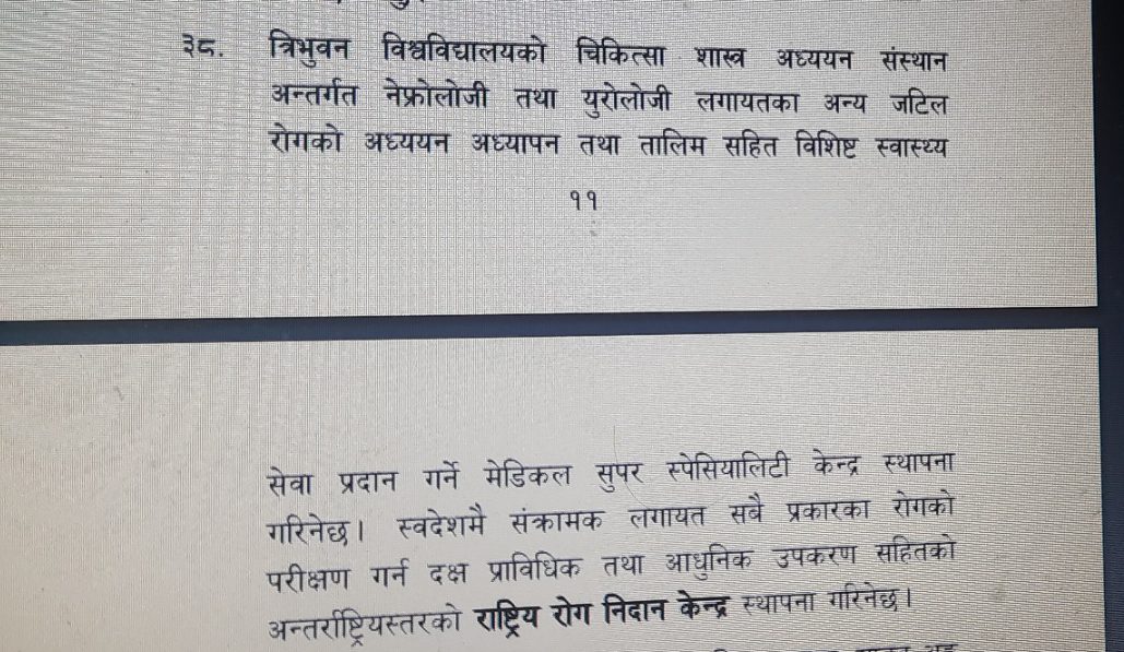 तीन वर्ष अघि अर्थात २०७७ जेठ १५ गते तत्कालीन अर्थ मन्त्री डा युवराज खतिवडाले सार्वजनिक गरेको आर्थिक वर्ष २०७७/७८ को बजेट बक्तव्यको ३८ नम्बर बुँदामा ‘त्रिभुवन विश्वविद्यालयको चिकित्साशास्त्र अध्ययन् संस्थान अन्तरगर्त नेफ्रोलोजी तथा युरोलोजी लगायतका अन्य जटिल रोगको अध्ययन् अध्यापन तथा तालिम सहित विशिष्ट स्वास्थ्य सेवा प्रदान गर्ने मेडिकल सुपर स्पेसियालिटी केन्द्र स्थापना गरिनेछ,’ भन्ने उल्लेख थियो ।