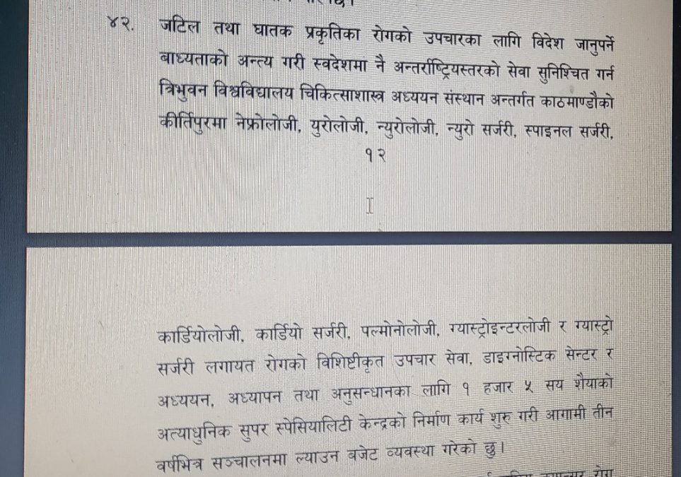 त्यसबेला बजेट बक्तव्यमा भनिएको थियो, ‘जटिल तथा घातक प्रकृतिका रोगको उपचारका लागि विदेश जानुपर्ने बाध्यताको अन्त्य गरी स्वदेशमा नै अन्तराष्ट्रिय स्तरको सेवा सुनिश्चित गर्न त्रिभुवन विश्वविद्यालय चिकित्सा शास्त्र अध्ययन संस्था अन्तगर्त काठमाडौँको कीर्तिपुरमा नेफ्रोलोजी, युरोलोजी, न्युरोलोजी, न्युरो सर्जरी, स्पाइनल सर्जरी, कार्डियोलोजी, कार्डियो सर्जरी, पल्मोनोलोजी, ग्यास्ट्रो इन्टेरोलोजी र सर्जरी लगायत रोगको विशिष्टीकृत उपचार सेवा, डाइग्नोस्टेक सेन्टर अध्ययन् अध्यापन तथा अनुसन्धानका लागि १ हजार ५ सय शैय्याको अत्याधुनिक सुपरस्पेश्यालिटी केन्द्रको निर्माण कार्य सुरु गरी तीन वर्ष भित्र सञ्चालनमा ल्याउन बजेट विनियोजन गरेको छु ।’