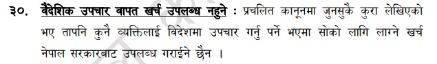 यस ऐनमा नेपालमा सम्भव भएका उपचारका लागि विदेश जाँदा उपचार खर्च नव्यहोर्ने व्यवस्था गरिएको छ । ऐनको दफा ३० मा कुनै पनि व्यक्तिले विदेशमा उपचार गरेमा सरकारले खर्च उपलब्ध नगराउने भनिएको छ । ‘कुनै पनि व्यक्तिलाई विदेशमा उपचार गर्नुपर्ने भएमा उपचारका लागि लाग्ने खर्च नेपाल सरकारबाट उपलब्ध गराइने छैन’, ऐनको दफा ३० मा भनिएको छ ।
