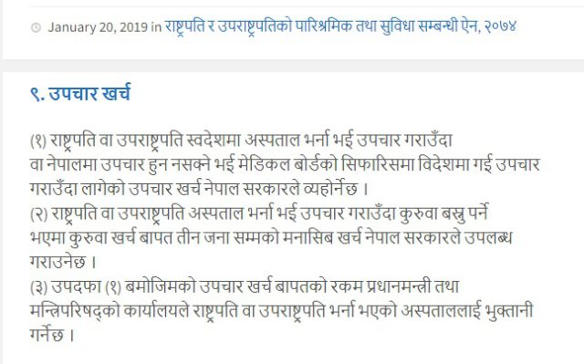 प्रधानमन्त्री कार्यालयका सचिव लिलादेवी गड्तौला (निरौला)ले २३ कात्तिकमा पठाएको जवाफमा पनि राष्ट्रपति र उपराष्ट्रपतिको पारिश्रमिक, सुविधा तथा सेवा सम्वन्धी ऐन २०७४ को दफा ९ अनुसार नै रकम भुक्तानी गरिएको उल्लेख छ । दफा ९ मा राष्ट्रपति वा उपराष्ट्रपति स्वदेशमा अस्पतालमा भर्ना भई उपचार गराउँदा वा नेपालमा उपचार हुन नसक्ने भई मेडिकल बोर्डको सिफारिसमा विदेशमा गई उपचार गराउँदा लागेको खर्च नेपाल सरकारले व्यवहोर्ने छ भनी उल्लेख छ ।
