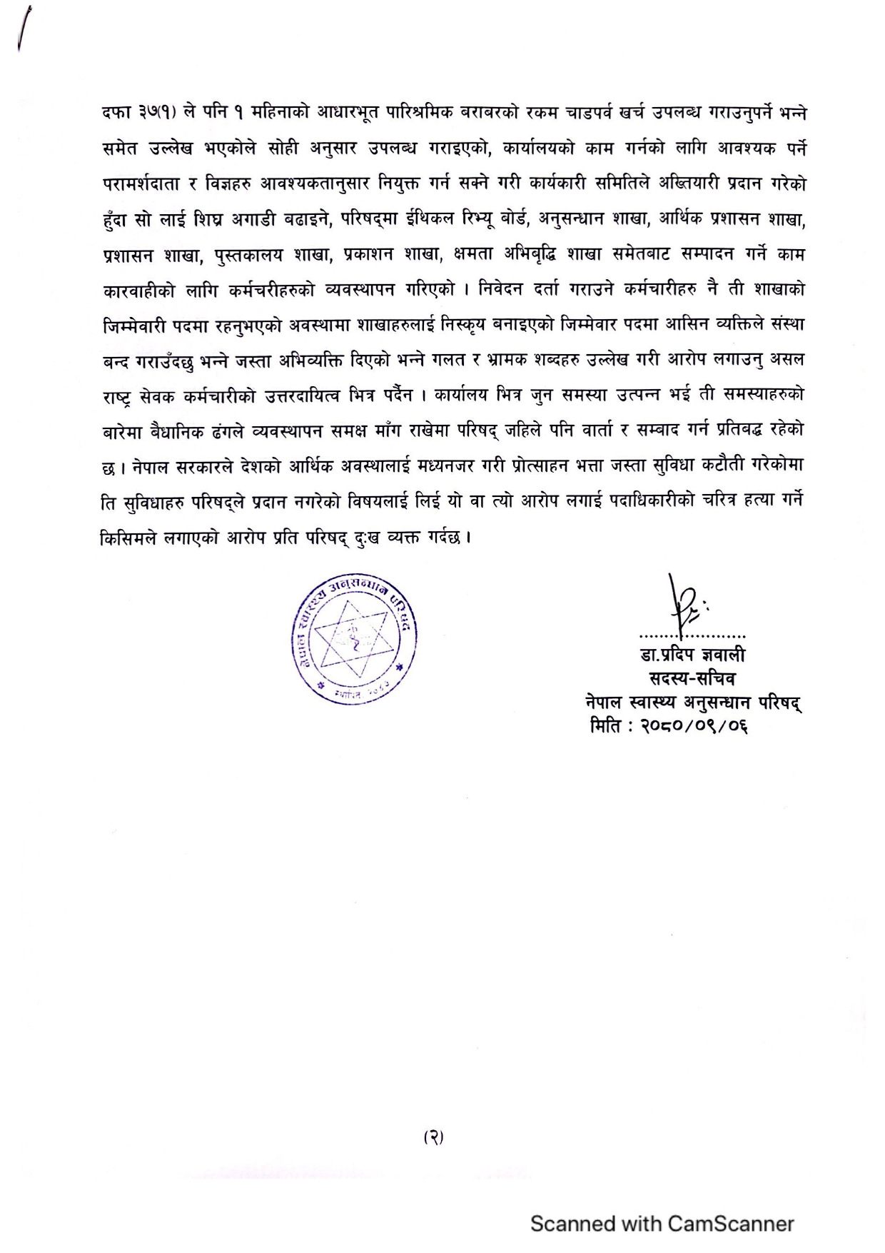काठमाडौँ, ६ पुस । नेपाल स्वास्थ्य अनुसन्धान परिषद्का सदस्य सचिव डा. प्रदीप ज्ञवालीको चार वर्षे कार्यकाल पुरा हुन ५० दिन पनि छैन, तर विहीबार १७ जना कर्मचारीले उनको राजिनामाको माग गर्दै स्वास्थ्य मन्त्री मोहनबहादुर बस्नेत, सचिव डा रोशन पोखरेललाई ध्यानाकर्षण पत्र बुझाएका छन् ।