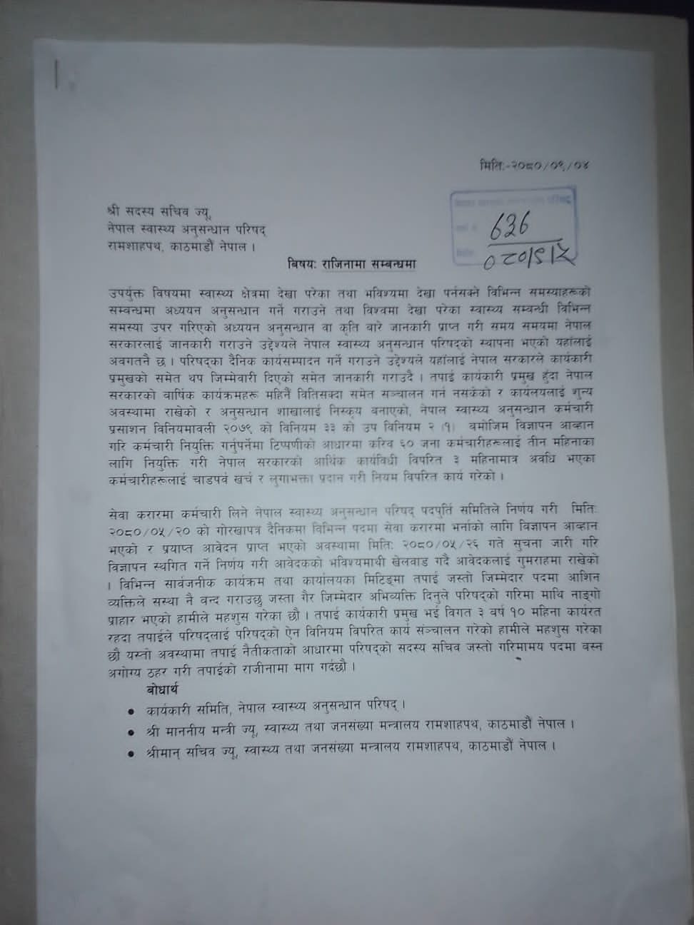उनले परिषदमा इथिकल रिभ्यु बोर्ड, अनुसन्धान शाखा, आर्थिक प्रशासन शाखा, प्रशासन शाखा, क्षमता अभिबृद्धि शाखाका जिम्मेवारमा पदमा बसेका कर्मचारीहरुले संस्था बन्द गराउछु भन्ने जस्ता अभिव्यक्ति दिएको भन्दै आफ्नो उत्तरदायित्व सम्झन् समेत आग्रह गरेका छन् ।