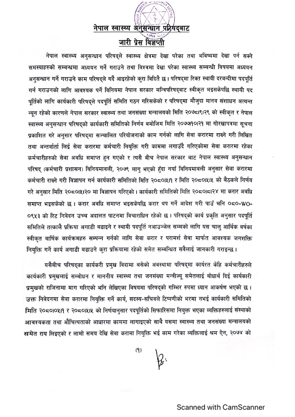काठमाडौँ, ६ पुस । नेपाल स्वास्थ्य अनुसन्धान परिषद्का सदस्य सचिव डा. प्रदीप ज्ञवालीको चार वर्षे कार्यकाल पुरा हुन ५० दिन पनि छैन, तर विहीबार १७ जना कर्मचारीले उनको राजिनामाको माग गर्दै स्वास्थ्य मन्त्री मोहनबहादुर बस्नेत, सचिव डा रोशन पोखरेललाई ध्यानाकर्षण पत्र बुझाएका छन् ।