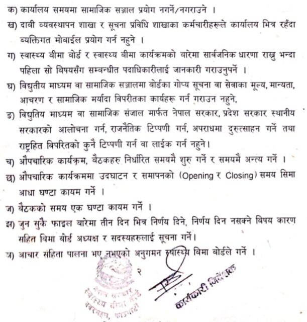 स्वास्थ्य बीमा बोर्ड र कार्यालयका कर्मचारीलाई १० बुँदे आचार संहिता :