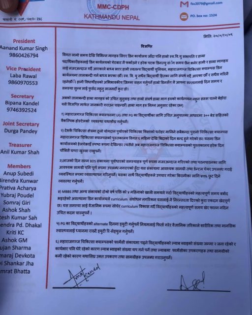 मागमा डीन कार्यालयले एकल ढंगले संस्थानलाई चलाउन खोजेको, क्याम्पस प्रशासनले विद्यार्थीका सामान्य माग समेत पुरा नगरेको, होस्टेलको अवस्था सुधार नभएको लगायतका असन्तुष्टि राखिएको छ । आन्दोलनमा आवासीय, इन्टर्नसीप, फार्मेसी लगायतका विद्यार्थीको साथ रहेको छ ।