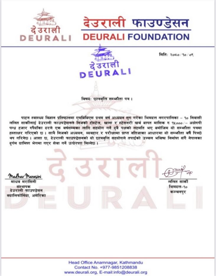 ललितको अध्ययन, व्यवहार र परीक्षामा प्राप्त नतिजाका आधारमा यो सम्झौता वर्षै पिच्छे थपिने सम्झौता पत्रमा उल्लेख गरिएको छ । देउराली फाउण्डेसनले यो छात्रवृत्ति सहयोगले ललितको उज्वल भविष्य निर्माण सँगै नेपालका दुर्गम ग्रामीण भेगमा गएर सेवा गर्ने उत्पे्ररणा मिल्ने विश्वास लिएको छ ।