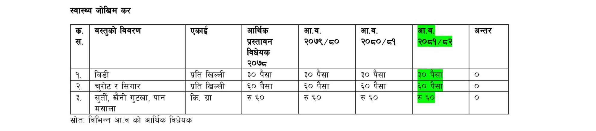 काठमाडौँ, १७ जेठ । बजेट पूर्व नै स्वास्थ्य तथा जनसंख्या मन्त्रालयले सुर्तीजन्य पदार्थमा करको दर यो वर्ष ३३ बाट बढाएर कम्तिमा ६८ प्रतिशत पुर्याउनु भन्दै अर्थ मन्त्रालयलाई पत्राचार गरेको थियो । बजेट प्रस्तुत गर्नु पूर्व अर्थमन्त्री बर्षमान पुन स्वयं पनि करको दर भारी मात्रामा बढाउने मुडमा देखिन्थे ।