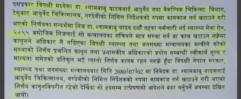यो विषय यसकारण पनि पेचिलो बन्यो कि उनै डा. यादवलाई गतवर्ष तत्कालीन मन्त्री मोहनबहादुर बस्नेतले मन्त्रीस्तरीय निर्णय गर्दै आयुर्वेद चिकित्सालय नरदेवीको निमित्त निर्देशक बनाएपछि सर्बोच्च अदालतमा मुद्धा परेको थियो । सो मुद्धामा सर्बोच्चले फैसला गर्दै सचिवले गर्ने काम मन्त्रीले गर्नु कानून विपरित भन्दै सरुवा सम्वन्धी निर्णय बदर गरिदिएको थियो । त्यसपछि यादव नरदेवी नगई आयुर्वेदमै बसेका थिए ।