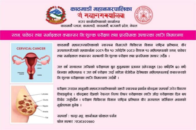 काठमाडौँ महानगरले चैत १२ गतेदेखि क्यान्सरको निःशुल्क परीक्षण गर्ने