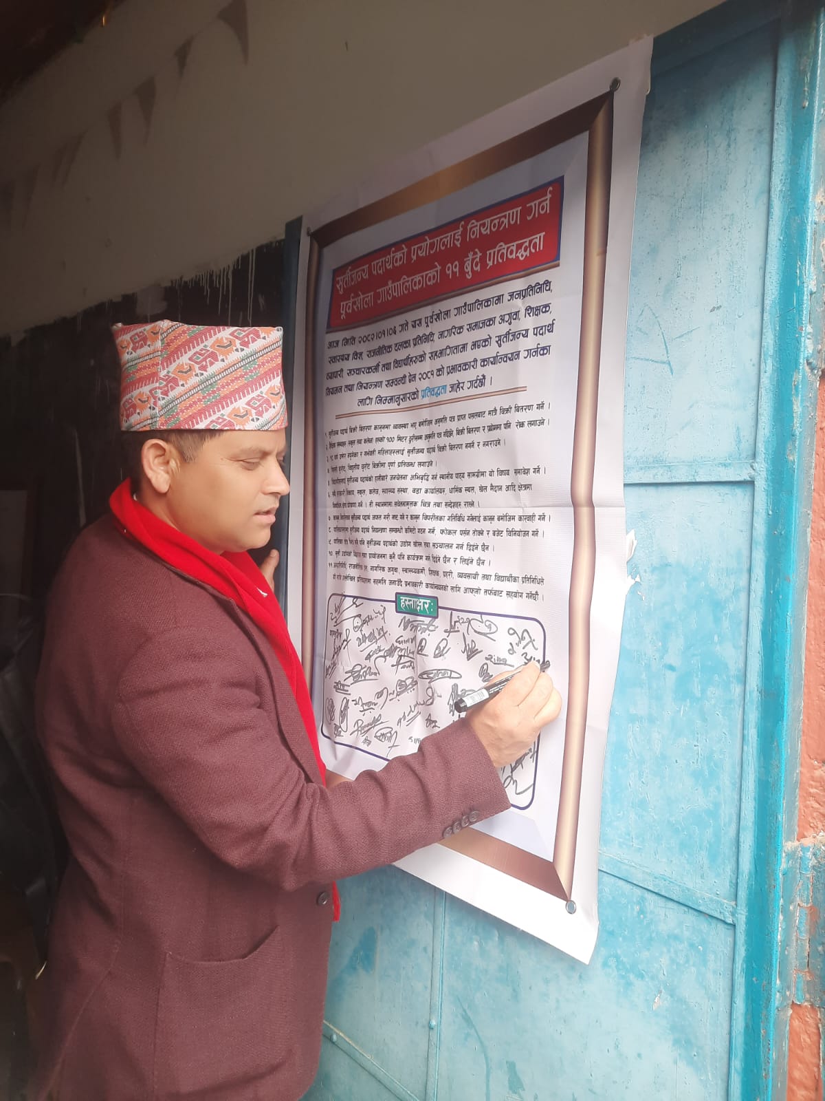 ‘सुर्तीजन्य पदार्थको कारणले लाग्ने कडा रोगको प्रकोप गाउँमा पनि भयावह रुपमा बढ्न थाल्यो । दैनिक जसो नै संघीय सरकारले दिने उपचार सहुलियत रकमका लागि निवेदन आउन थाले, हामीले सिफारिस गर्ने क्रम बढ्न थाल्यो, सिफारिसका लागि गरिने बैठक र त्यसपछि गरिने हस्ताक्षरले आफैमा पिडा दिन्थ्यो । कडा रोगबाट गाउँका भर्खरका युवा अनि प्रौडहरु प्रताडित हुँदै जाने, हामीले सिफारिस मात्रै गर्दै जाने हो भने त अवस्था भयावह नै हुने भयो । त्यसैले हामीले यसको न्युनिकरणका लागि आफ्नै कानून बनायौँ र यसलाई लागू गर्ने प्रयासमा अघि बढेका छौँ,’ एघार बुँदे हस्ताक्षर पछि कार्यक्रम बोल्दै गाउँपालिका अध्यक्ष नुनबहादुर थापाले भने ।