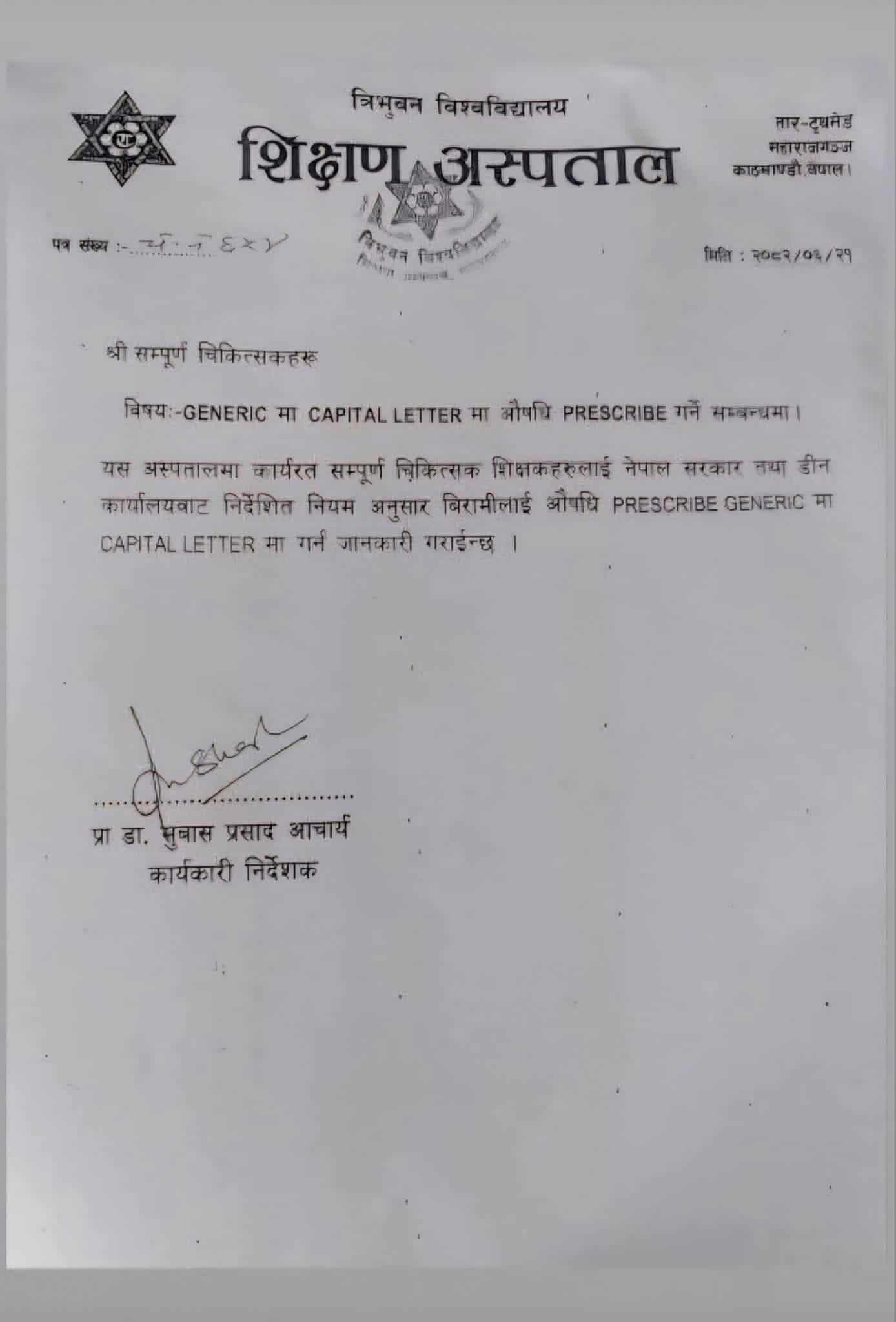 सूचनामा भनिएको छ, ‘यस अस्पतालमा कार्यरत सम्पूर्ण चिकित्सक शिक्षकहरूलाई नेपाल सरकार तथा डीन कार्यालयवाट निर्देशित नियम अनुसार बिरामीलाई औषधि ‘प्रेस्क्राइब जेनेरिक’मा ‘क्यापिटल लेटर’मा गर्न जानकारी गराईन्छ ।’
