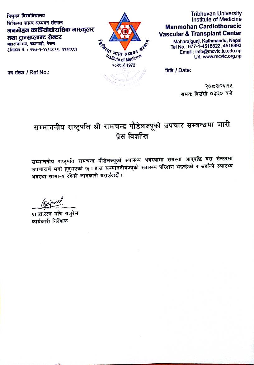 ‘राष्ट्रपति पौडेल ज्यूको स्वास्थ्य अवस्थामा समस्या आएपछि यस सेन्टरमा उपचारार्थ भर्ना हुनुभएको छ । हाल सम्माननीय ज्यूको स्वास्थ्य परीक्षण भइरहेको र उहाँको स्वास्थ्य अवस्था सामान्य रहेको जानकारी गराउँछौँ,’ कार्यकारी निर्देशक प्राडा रत्नमणि गजुरेलले हस्ताक्षर गरेको विज्ञप्तीमा उल्लेख छ ।