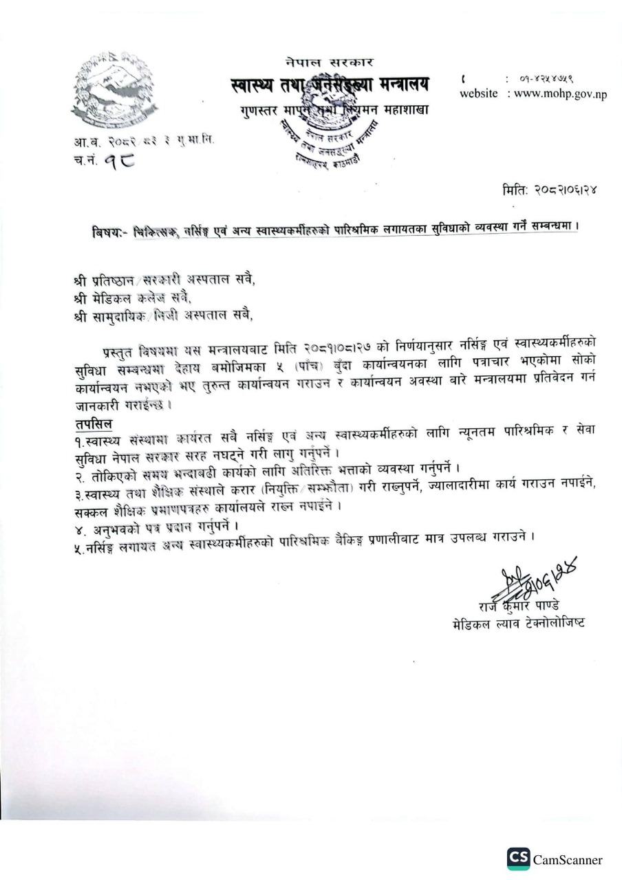 नर्सिङ तथा स्वास्थ्यकर्मीहरुलाई सरकारी सरह तलव सुविधा उपलव्ध गराउन अस्पताल तथा मेडिकल कलेजहरुलाई मन्त्रालयको निर्देशन