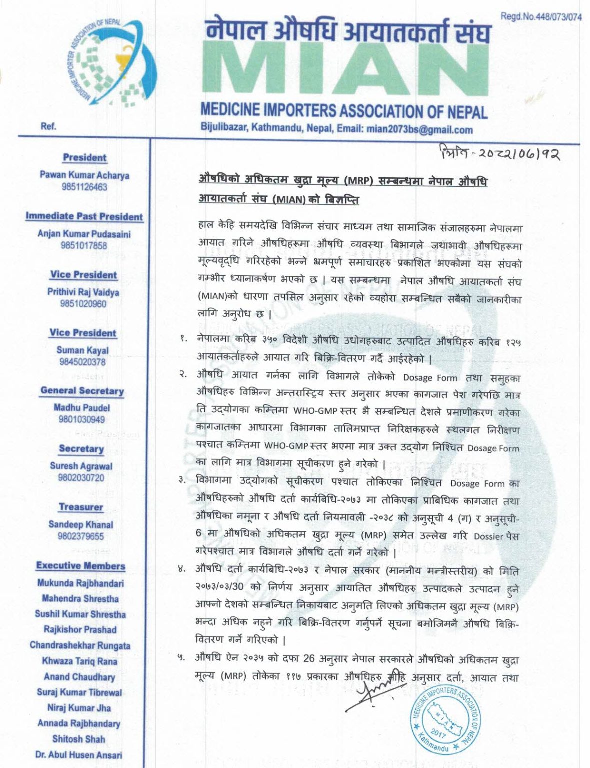 उसले आज विज्ञप्ती जारी गर्दै आयातित औषधीको सन्दर्भमा समाचारमा आए जस्तो औषधी व्यवस्था विभागले जथाभावी रुपमा मूल्य बृद्धि नगरेको दावी गरेको छ ।