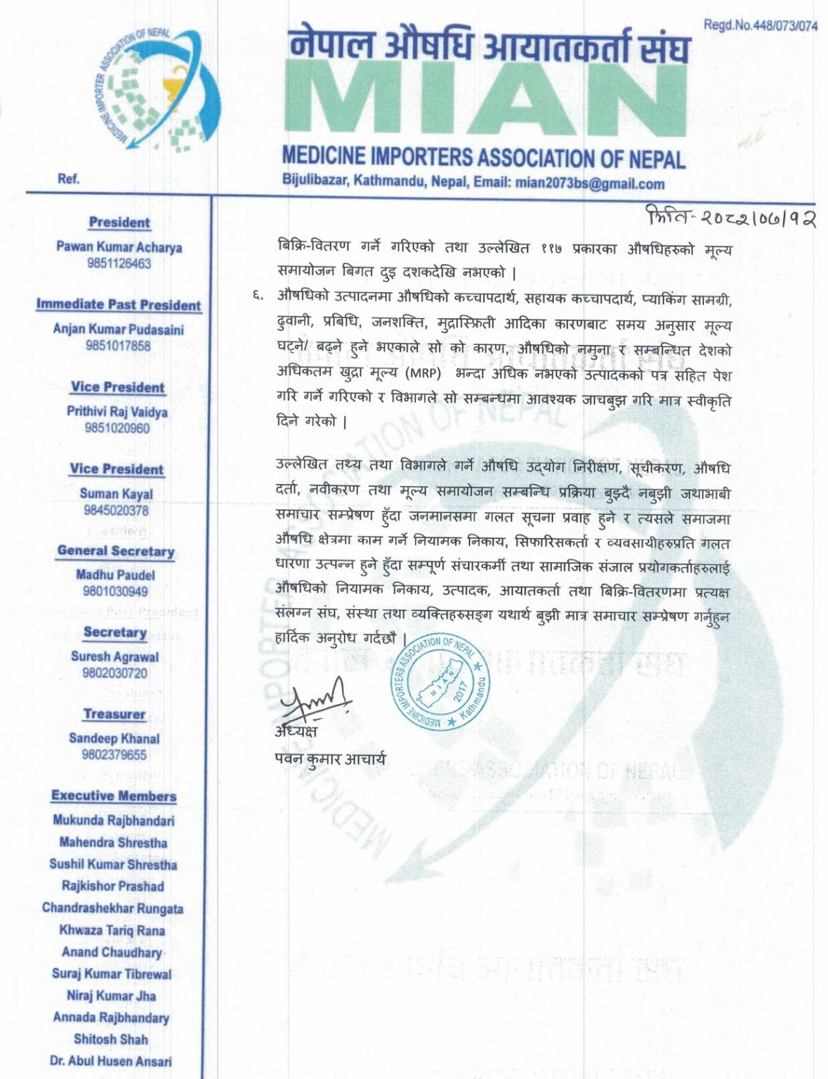 यस्तै औषधी ऐन २०३५ को दफा २६ अनुसार नेपाल सरकारले ११७ प्रकारका औषधीहरुमा अधिकतम खुद्रा मूल्य निर्धारण गरेको र ती मूल्यहरु विगत दुई दशकदेखि अद्यावधिक नभएको बताएका छन्। साथै औषधीको उत्पादन र वितरणमा कच्चा पदार्थ, प्याकिंग सामग्री, ढुवानी, मुद्रास्फ्रिती जस्ता कारणले मूल्यमा समयअनुसार फरक पर्न सक्ने हुँदा सम्बन्धित उद्योगले प्रमाणित पत्रसहित पेश गरेमा मात्र विभागले मूल्य समायोजन अनुमति दिने प्रक्रिया रहेको उल्लेख गरिएको छ।