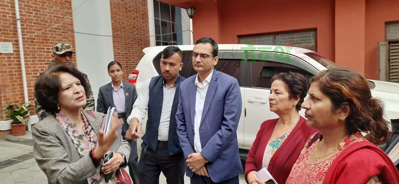काठमाडौँ, १२ असोज । बुधबार अपरान्ह सिंहदरबारमा बैठक सकेर स्वास्थ्य तथा मन्त्रालय छिरेकी स्वास्थ्य मन्त्री डा. सुधा शर्माको गाडीबाट ओर्लदै गर्दा नेपाल नर्सिङ संघ र निजी अस्पताल सञ्चालकको संस्था (अफिन)को नेतृत्व तहका व्यक्तिसंग जम्का भेट भयो ।