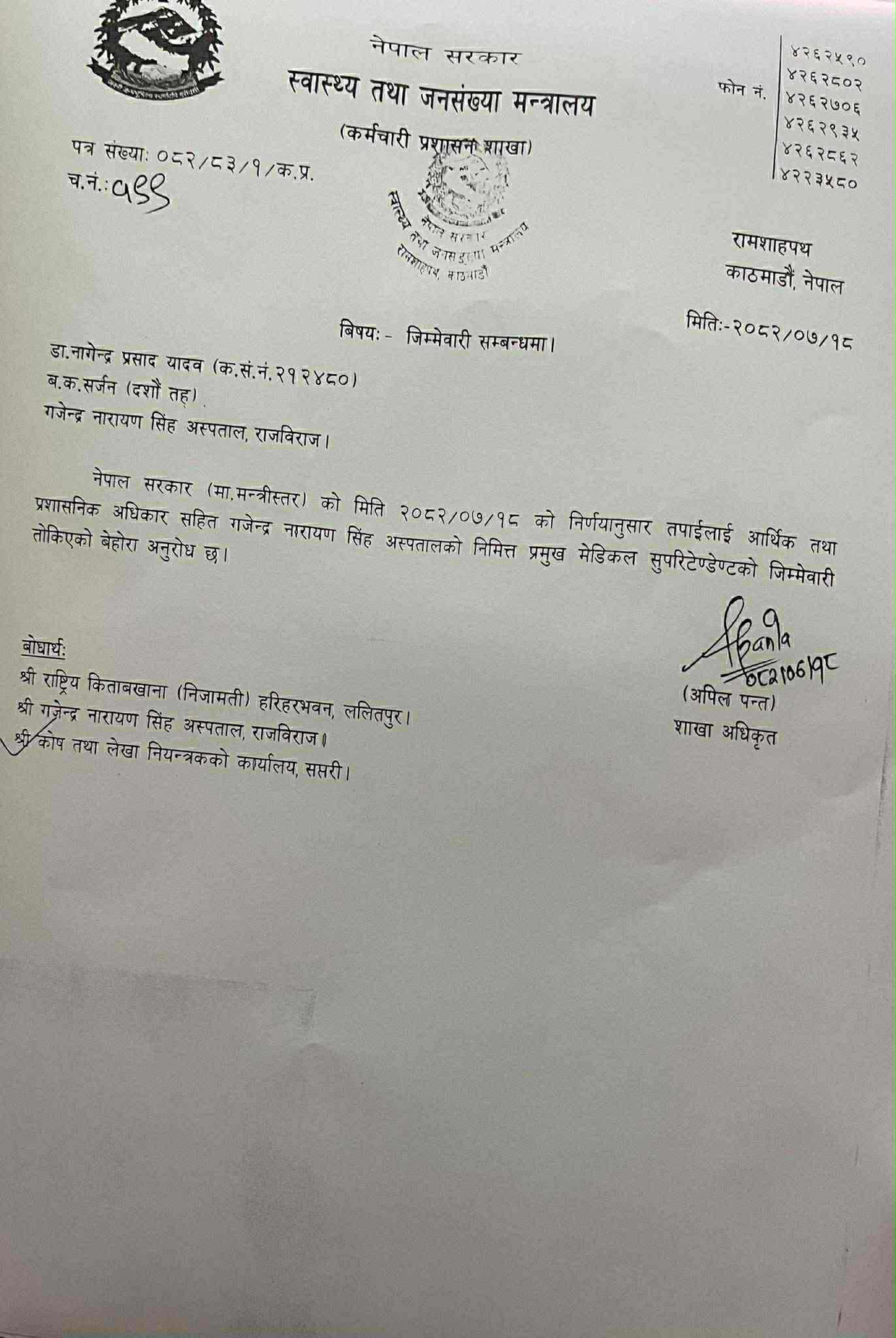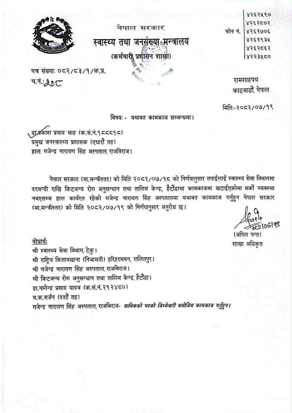 डा.  साहलाई १९ कात्तिकमा पठाइएको पत्रमा ‘१८ कात्तिकको निर्णय अनुसार तपाईँलाई स्वास्थ्य सेवा विभागमा दरबन्दी राखि किटजन्य रोग अनुसन्धान तथा तालीम केन्द्र हेटौँडा खटाइएकोमा अर्को व्यवस्था नभएसम्म हाल कार्यरत रहेको गजेन्द्रनारायणसिंह अस्पतालमा यथावत कामकाज मन्त्रीस्तरीय निर्णय अनुसार अनुरोध छ,’ भन्ने उल्लेख छ ।