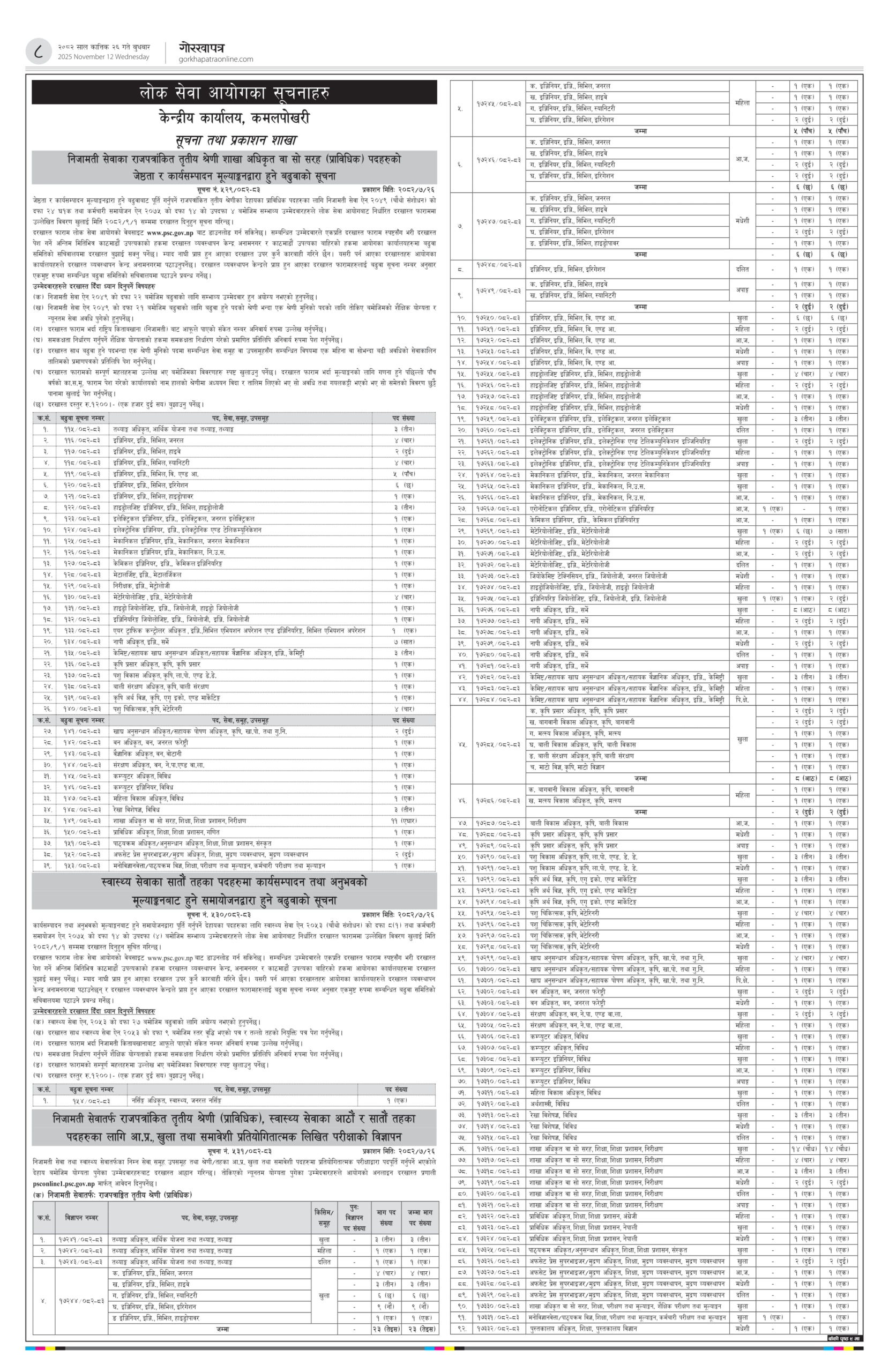 आयोगले बुधबार गोरखापत्रमा सूचना प्रकाशित गर्दै निजामतितर्फ प्राविधिकको राजपत्रांकित तृतीय श्रेणी र स्वास्थ्य सेवाका आठौं र सातौं तहका पदहरूका लागि आवेदन खुलाएको हो।