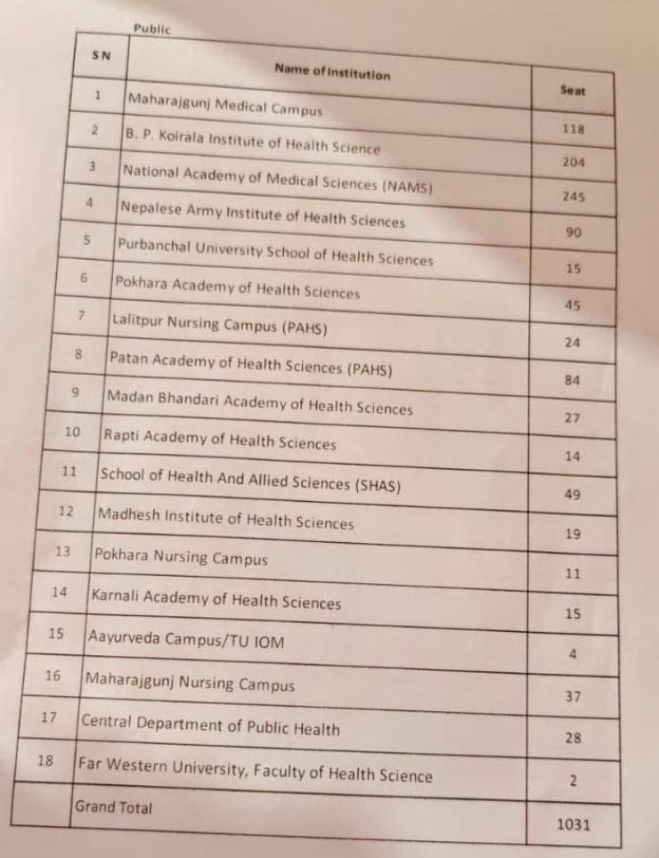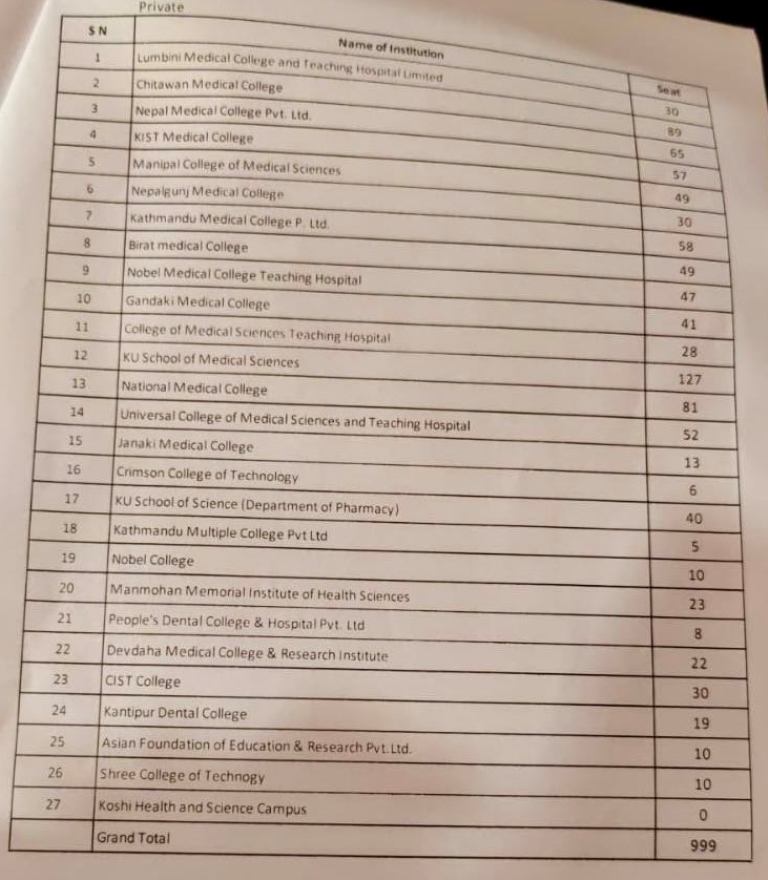 बैठकले सरकारी तर्फका १८ कलेजलाई १ हजार ३१ र निजी तर्फका २७ वटा कलेजलाई ९९९ गरी २ हजार ३० सिट निर्धारण गरेको छ।