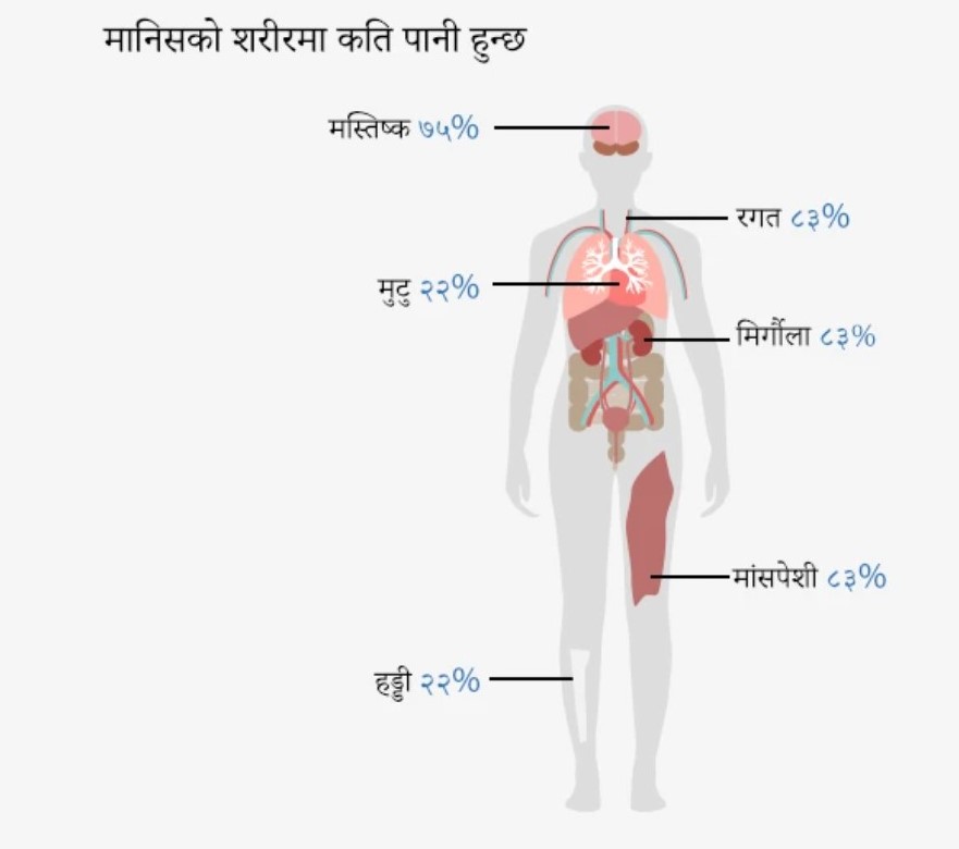 हाम्रो शरीरको तौलको झन्डै ६० प्रतिशत हिस्सा पानीले ओगट्छ। हाम्रा कोषहरू, अङ्गहरू, रगत र विभिन्न भागमा पानी हुन्छ।
