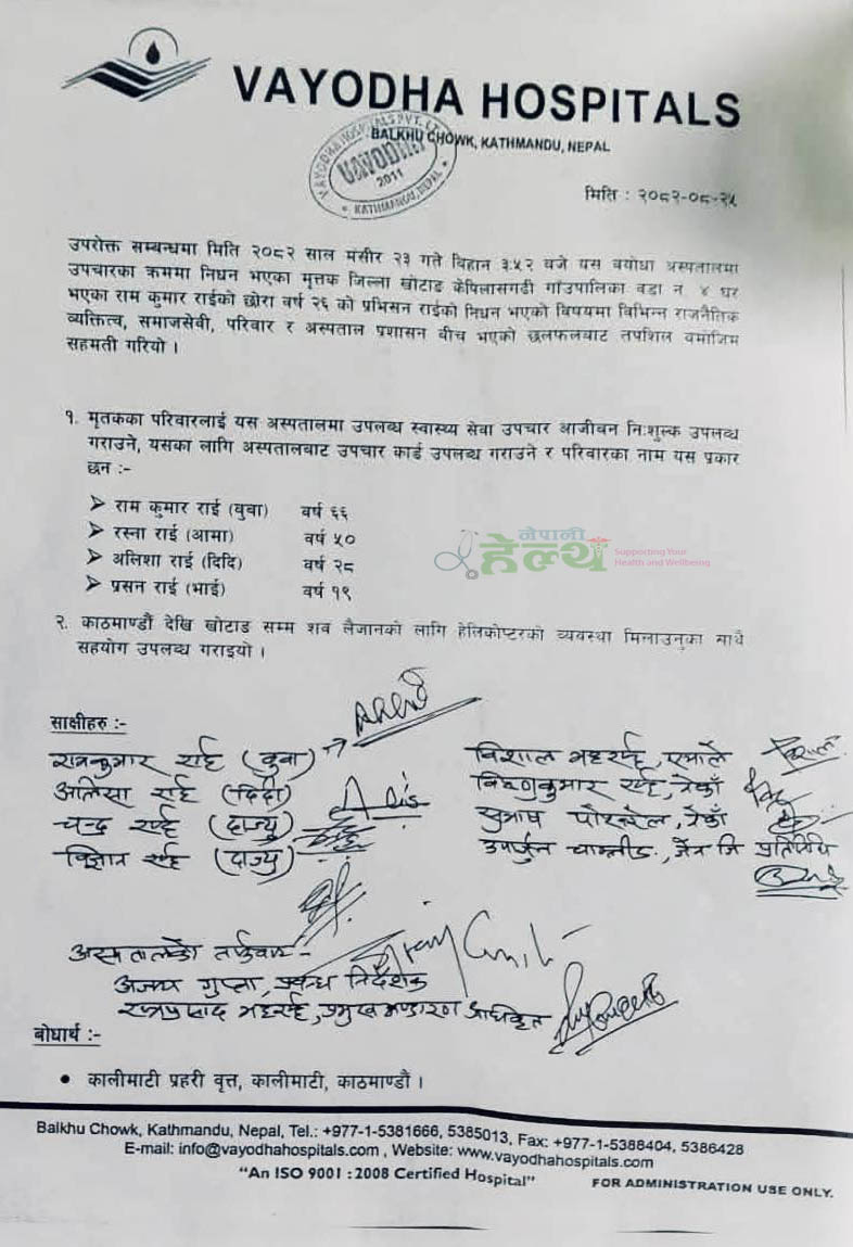 दुई बुँदे सहमति गर्न मृतकका परिवारका तर्फबाट रामकुमार राई, दिदी अलिसा राई, दाजु चन्द्र राई र विज्ञान राई थिए भने अस्पतालको तर्फबाट प्रवन्ध निर्देशक अजय गुप्ता र प्रमुख भण्डारण अधिकृत रामप्रसाद भट्टराई थिए ।