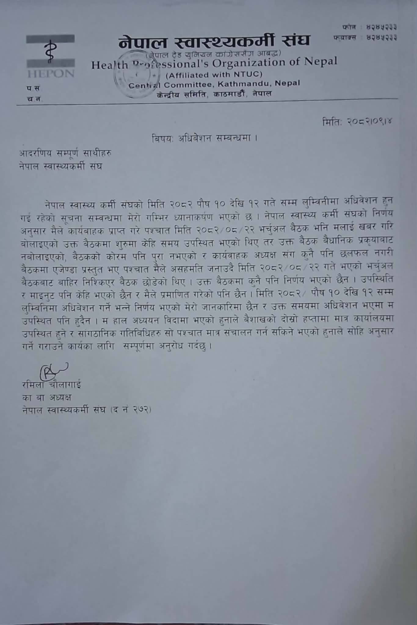 नेपाल स्वास्थ्यकर्मी संघको लुम्बिनीमा हुन लागेको अधिवेशन प्रति कार्यवाहक अध्यक्षको असहमति