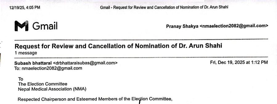 काठमाडौँ, ५ पुस । नेपाल चिकित्सक संघको निर्वाचन समितिले गरेको निर्णय विवादमा परेको छ । संघको उपाध्यक्ष (बागमती प्रदेश संयोजक) मा उम्मेद्धारी दिएका डा. अरुण शाहीको वारेसनामा नमिलेको भन्दै उम्मेद्धारी रद्ध गरेपछि निर्णय विवादमा परेको हो ।